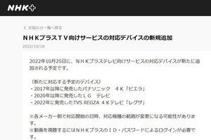 NHKは、ネット配信サービス「NHK+」について、対応テレビが10月25日より拡充されると発表した。新たにNHKプラスに対応するテレビは下記のとおり。各メーカー側で対応開始の日時、対応機種の範囲が変更になる可能性もあるとしている。