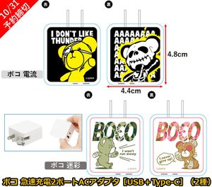 「アダプタから電気が漏れてしまった…?」様子が描かれた豪快な「ボコ 電流」と、白地に映える「ボコ 迷彩柄」の2つのデザインを用意。PowerDeliveryとQuickCharge3.0のいずれにも対応し、最大20Wの急速充電もサポートする。