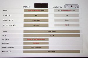 音声フォーマットはDolby AtmosやDTS:X、新4K/8K衛星放送で使用されているMPEG-4 AAC(ステレオ、5.1ch)に対応。映像フォーマットは8K / 60Hz、4K / 120Hz、HDR10+、HDCP 2.3、eARCに対応している。なお「CINEMA 50」が対応するIMAX Enhanced、Auro-3D、360 Reality Audioへの対応は本機では省いている。