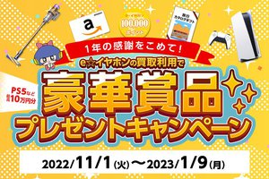eイヤホンは、PS5など最高10万円分の賞品が当たる買取キャンペーンを11月1日から2023年1月9日まで実施する。