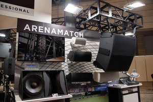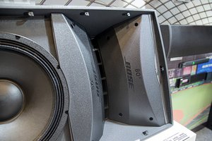 ボーズブースでは競技場やスタジアム、エンターテインメント施設向けのモジュール型スピーカー「ArenaMatch」シリーズが展示された。主な導入先となるスタジアムといった規模の大きい野外施設は音の指向性制御が難しいとされているが、本シリーズでは出音の放射角度(水平・垂直)を着脱可能なウェーブガイドでコントロール可能となっているという。