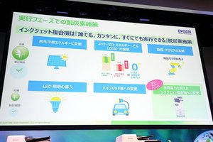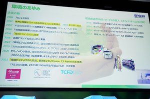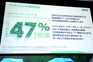1980年頃から長きにわたり環境問題に取り組み、2010年にオフィス・ホーム向け大容量インクタンクシステム搭載プリンターを販売、2014年には「スマートチャージ」の提供開始や紙のサイクルを変える技術「ドライファイバーテクノロジー」を搭載するなど、「環境配慮型の製品やサービスを多数投入してきた」と説明した。