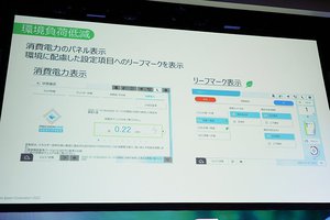 パネル表示においても、ユーザーが印刷で使用した消費電力を確認できる消費電力表示や両面印刷など環境に配慮した設定項目へのリーフマーク表示で環境活動への取り組み改善を促している。