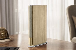 デザイナーのBenjamin Hubert(ベンジャミン・ヒューバート)氏が手掛けた、B5判サイズの書籍のようなスリムな形状を採用する多機能スピーカー。ゴールドトーンのアルミニウムボディをオーク材のサイドパネルで挟み込み、スピーカー前面には、本の背表紙に記される著者名のようにブランドロゴを配置。インテリアと見事に調和しつつ、省スペースで音を広げることができるよう設計しているという。