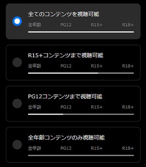 レーティングの具体は「全てのコンテンツ」、「R15+コンテンツまで(「R18+」作品、グラビア作品の視聴不可)」「PG12コンテンツまで(「R18+」「R15+」作品、グラビア作品の視聴不可)」、「全年齢コンテンツのみ視聴可能(「R18+」「R15+」「PG12」作品、グラビア作品の視聴不可)」。子供と一緒に家族でDMM TVを利用する方は、自身でプロフィール機能からこれらの視聴制限の設定が必要となる。