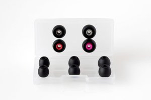 イヤーピースはシリコン製の「TYPE E」を5サイズ(SS/S/M/L/LL)同梱。軸の色をそれぞれ変えることで左右やサイズの判別をしやすくしている。ほか、シリコン製のイヤホンキャリーケースも付属する。