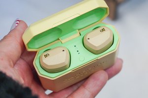 ケースもイヤホン本体同様に外側はベージュで、フタ部分とイヤホン収納部とでトーンを変えている。フタを開くと内側には鮮やかなピスタチオグリーンが用いられており、他にはないデザインも魅力の一つ。底面には充電用USB-C端子を備え、急速充電およびQi規格のワイヤレス充電にも対応する。イヤーチップはベージュ色のシリコンタイプと、フォームタイプをそれぞれ3サイズずつ同梱する。