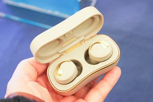 以前にイベントに参考出品された際から外観がアップデート。アクセントになっているゴールドカラーの部分が、艶感のあるものからマット仕上げに変更されている。イヤーピースもオリジナル品で、骨伝導ドライバーの搭載によりイヤホンを耳に密着させる必要があることから、新規に開発したという。傘部分のスカラップデザインが特徴的だ。