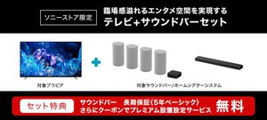 ソニーは、直営店「ソニーストア」各店舗にて、対象のテレビとサウンドバー/ホームシアターシステムを組み合わせた限定セットを用意。セットで購入したお客様限定で、「サウンドバー長期保証<5年ベーシック>」および「プレミアム設置設定サービス」が無料となるセット購入特典を提供する。