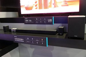ULED Xでは110型8Kモデルも参考展示。またテレビ以外では、別体のサテライトスピーカーやサブウーファー付きで総合出力570W、ハイレゾ認証も取得し、ドルビーアトモスやDTS:Xにも対応する7.1.2chサウンドバー「U5120GW+」なども展示されていた。