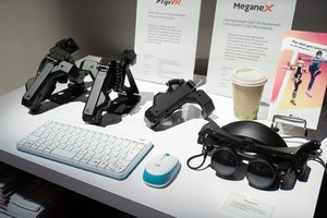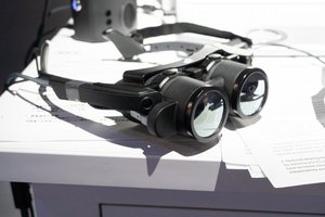 このほか、子会社ShiftallのVRヘッドセット「MeganeX」や今回のCESで発表した新VR用コントローラー「FlipVR Controller」も用意。また参考出展として、スペインのBiel Glasses社と共同で実証を進めているという弱視支援グラスのプロトタイプも披露していた。
