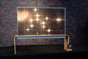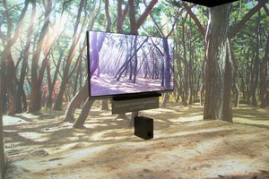 また、透明なディスプレイを採用する「OLED T」も展示。こちらは透明と不透明な状態が切り替えられるようになっており、テレビとしての使い方だけでなく、ガラスの仕切りとして、半透明のアート作品としてなど、空間デザインの可能性を広げる製品だという。また、ベースには曲げ木を採用することで、室内に自然の要素をもたらすとのこと。