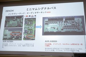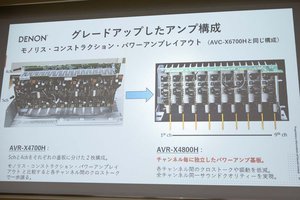 前モデルの「AVR-X4700H」のパワーアンプ部基板(9ch)は5ch/4chの2枚構成だったが、4800Hではチャンネル毎に独立したモノリス・コンストラクション・パワーアンプレイアウトを採用。これは上位機のAVC-X6700H、フラグシップ機の「AVC-X8500HA」と同じ構成で、各chが独立しているためクロストークや振動の影響を排除し、全ch同一のサウンドクオリティを実現できるとする。