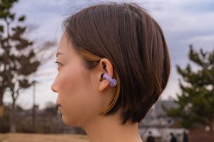 ambie「AM-TW01」はイヤーカフ型の完全ワイヤレスイヤホン。耳をはさむように装着することで、耳穴を塞ぐことなく、周囲の環境音も取り込んだ自然なリスニングが楽しめるモデルとなっている。