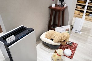 ペットとの暮らしを想定したブースでは、部屋のにおい対策に最適な次亜塩素酸空間除菌脱臭機ジアイーノ「F-MV5400」を設置。除菌、脱臭、加湿、集じんが本機1台で行える。一時的に次亜塩素酸濃度を高めてより集中的に除菌・脱臭を行う「集中クリーンモード」は、実際にペットを飼うお客様から高い評価を集めている。