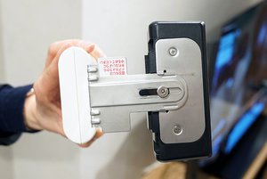 アパートやマンションの部屋にモニターカメラがない場合に最適なモニター付きドアカメラ「VS-HC400」の展示ブーズでは、ワイヤレスドアカメラを玄関のドアに掛けて固定するだけの簡単設置をアピール。モニター親機から来訪者の確認が行えるようになる。