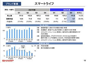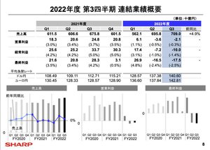 シャープは、2022年度第3四半期の連結決算業績の説明会を開催した。連結業績は、売上高が前年同期比4.9%増の7090億円となったものの、営業損益では21億円の赤字、経常損益が100億円の赤字、最終損益が175億円の赤字となった。