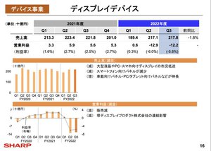 シャープの2022年度3Q決算、ディスプレイ需要の低迷などで減益。連結業績予想を下方修正