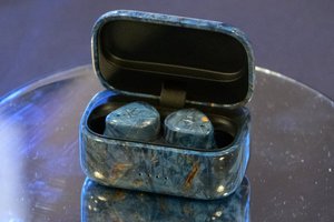 イヤホン本体のシェル、および充電ケースの外装素材として、木材に樹脂を含浸させた「スタビライズド・ウッド」を採用。塗料を含んだ樹脂が浸透・硬化することで強度が高まるだけでなく、木目などを反映した複雑な模様を描き、1点1点異なるデザインを実現している。