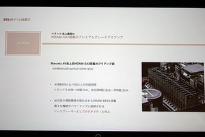 プリアンプ回路には、マランツがピュアオーディオのHi-Fiコンポーネントで培ってきた回路設計のノウハウを投入。その心臓部に投入するアンプモジュールは、独自のディスクリート高速アンプモジュール「HDAM-SA3」を採用。これまでのAVプリアンプでは主に「HDAM-SA2」型の回路が採用されてきたが、今回、定電流回路とカスコードブートストラップ回路を備える「HDAM-SA3」を採用することで、歪を限界まで抑え、さらに精度の高い増幅を行えるよう図ったという。