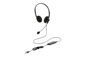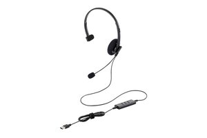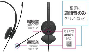 会議に集中できる「両耳モデル」と、周りの音も聞ける「片耳モデル」の2種類を用意。マイク基部を回転させることで、左右問わずに着用することができる。接続端子はUSB Type-Aを採用し、パソコンと接続するだけで使用可能。ケーブル長は1.9m、マイクミュートと音量調整を手元で操作できるインラインコントローラーが搭載される。