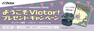 2月28日(火)から3月8日(水)23:59までの期間中、JVCケンウッドストアに新規会員登録することでビクターの最小・最軽量完全ワイヤレス「HA-A30T」と、蓄音機に耳を傾ける姿でお馴染みのニッパー犬の絵本「NIPPER -His Master’s Voice-」が10名にプレゼントされるキャンペーン。