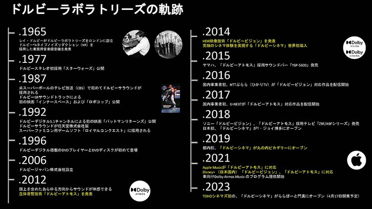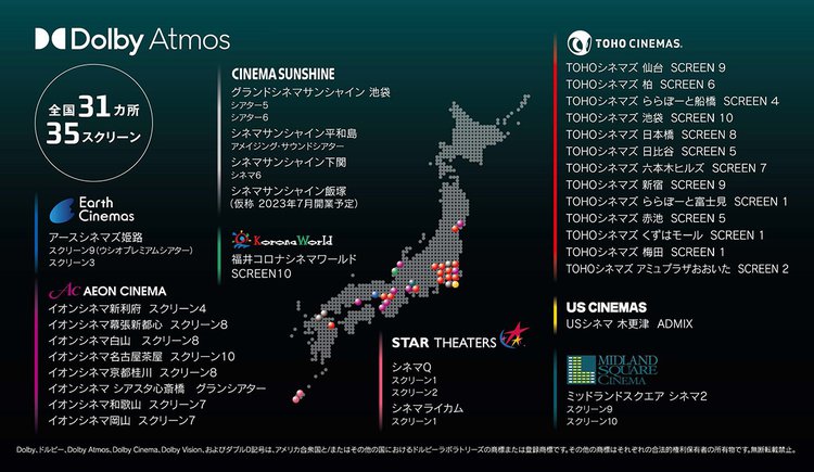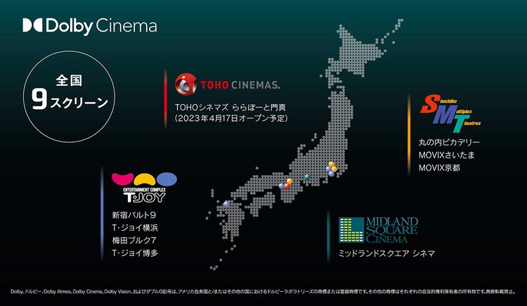 そこからわずか2年後となる2014年、現在日本各地で上映館が増える「ドルビーシネマ」の基本となる映像用技術「ドルビービジョン」が登場する。なお、日本初のドルビーシネマ館は2018年に「T・ジョイ博多」に導入。今年2023年には、TOHOシネマズ初のドルビーシネマ館として「TOHOシネマズ ららぽーと門真」(大阪府)が4月にオープンする。