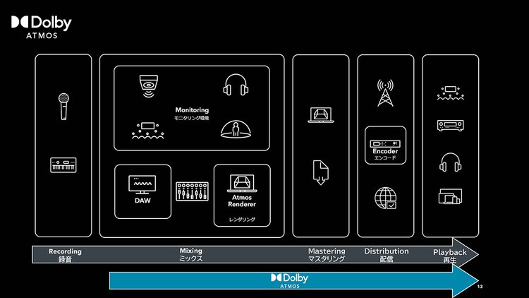 そんなドルビーアトモス音響の制作について、“簡単に”ではあるが萩谷氏が解説。収録→ミックス→マスタリング→エンコード→配信(パッケージ化)→ユーザーによる再生…という大きな流れこそステレオ時代と変わらないものの、ポイントによって使用するツールや再生に用いる製品が一つずつ変わっただけだという。