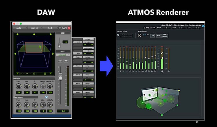 また、ドルビーアトモスリミックスでは、一つのファイルでどの環境でも再生できることも注目すべき利点の一つで、ヘッドホン用、ホームシアター用など再生機器に応じたリミックスを個別に作ることなく、一つのフォーマットで再生機器に応じた最適化を行える。