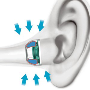 外圧によって変化するエアータンクは耳の形に沿うように高いフィット感を提供。コア部分も芯を最小限とすることで装着に伴う痛みに配慮する。素材はリキッドシリコンを使用し、肌に優しい装着感を提供する。