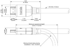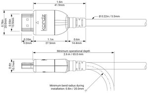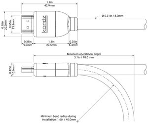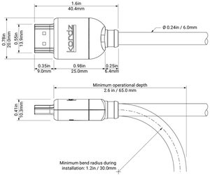 ケーブル外形は0.5 - 3mモデルが30 AWG 6mm、4 - 5mモデルが26 AWG 8mm。ケーブル最小曲率半径は0.5 - 3mモデルが30mm、4 - 5mモデルが40mm。