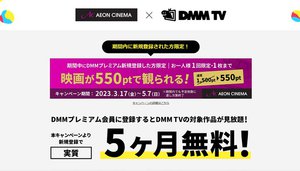 さらに、対象期間中に新規でDMMプレミアム会員登録すると、イオンシネマで使える映画鑑賞チケットが初回1枚に限り、通常DMMポイント1,500ptのところ、550ptで購入できるキャンペーンも開催する。期間は5月7日まで。2回目以降は1,500ptでの発行となる。