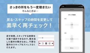 3つめに、聴き取れなかった部分の聴き直しや不要な箇所をスキップできる「3秒戻し&10秒スキップ」。再生中にワンタッチで“3秒戻す”“10秒進める”ことができる。秒数は設定画面から変更できる。