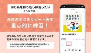 2つめは、指定した区間を繰り返し再生する「A-B間リピート再生機能」。リピート区間の開始位置と終了位置は個別で自由に設定できる、開始位置は変えずに終了位置だけ少しずつ伸ばしていく直感的な学習も行える。リピート区間内での一時停止も可能で、特定の長文リスニング問題のナレーション部分だけ、途中で止めながら繰り返しトレーニングするといった使い方もできる。