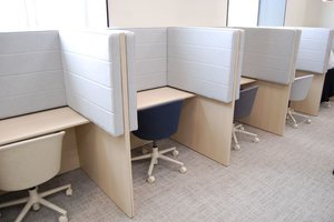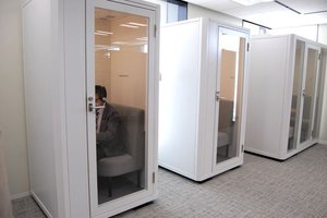 オンライン会議に対応した「テレキューブ」、会議などに最適な「フォーカスルーム」などミーティングも多様な用途に対応したスペースを用意。吸音性のパネルを使用した個人で集中できるスペースも窓際を中心に数多く設けられている。