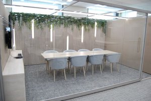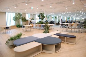 「コミュニケーション×サステナブルで新たな価値を」をテーマに、実際の製品を体感できるショールームを兼ねた環境配慮型のライブショールームオフィス。「環境配慮」「生産性・快適性の向上」「健康」の3つをコンセプトに、ポストコロナの働き方やSDGsへの取り組みを進めたのが大きな特徴だ。コロナ禍に社内のコミュニケーション欠如が課題とされるなか、「社員が行きたくなるオフィス」を目指し、同グループの総合力を活かしたさまざまな提案が盛り込まれた。