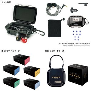 フルカスタム/セミカスタムともに、FitEar cable 004BLK(黒)ケーブル、各ブランドロゴのシール付きペリカン1010ケース(黒)、メッシュポーチ(黒)、クリーニングブラシ、ケーブルクリップが付属。梱包も各ブランドオリジナルデザインBOXを用意。セミカスタムのみ、イヤーピースとしてAZLA SE-1500も付属する。