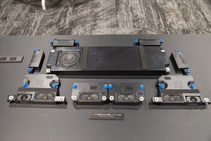 従来機からスピーカー構成も刷新され、高域再生部にトゥイーターでは無くフルレンジスピーカーを装備。高域部ユニット変更について、有機モデルではスクリーンスピーカーを用いることでボーカル表現を担保できるが、構造上液晶モデルでは困難だということについて触れた上で、フロントのメインスピーカーとのマッチングを考慮してフルレンジ化。ボーカルの厚い肉声が画面の中心から聴こえてくるチューンになったという。