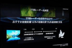 TVS REGZAの開発陣も、地デジなどの放送番組やネット動画を観ながら画質のチューニングを行う際、2.5〜3倍の距離で実施することが多く、またミリ波レーダーで最適化するときも、1.5倍は近距離、2.5〜3倍はオススメ距離、6倍までが遠距離としてチューニングを行っているとのこと。