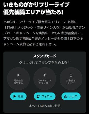 Amazon Musicは、期間限定のスタンプカード機能を使用した「いきものがかりフリーライブ優先観覧エリアが当たる」キャンペーンを本日4月11日(火)より開始する。期間は4月24日(月)23時59分まで。