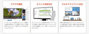 前モデルでもフォローしていた電子黒板機能、最大20点のポイントを検出するタッチパネル機能、ミラーリング表示機能に加え、本モデルではインターネットブラウザ、オフィスソフト互換ソフトウェアの搭載。同時に最大4台のクライアントからワイヤレス接続表示する「マルチクライアント対応」を新たに備える。