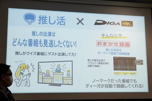 さらに好きな番組ジャンルを調べたところ、レコーダー購入意欲がある方ではアニメが1位、ドラマが3位に選ばれたとのこと。ここから、ドラマ・アニメ1クール自動録画機能を搭載した新ディーガは「推し活ユーザーとの親和性が高い製品」だと説明。おまかせ録画機能で推しの名前をキーワード登録しておけばバラエティ番組への出演も見逃すことなく、BD/DVDにダビングして「推しの作品を手元に残しておくこともできる」とした。