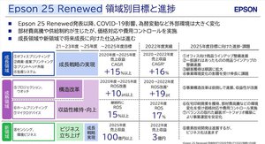 長期ビジョン「Epson 25 Renewed」の2022年度での進捗状況については、「コロナ影響など外部環境に大きな変化があったものの、部材費高騰、供給制約に対して価格対応や費用コントロールを実施、収益の確保を継続した。成長領域や新領域で製品ラインナップを拡大、コア技術の進化など将来への仕込みを進めた。今後もさまざまな環境変化に対応し成熟領域で安定的に資金創出し、成長領域の強化・伸長を図る」と説明した。