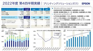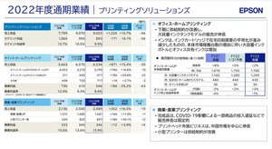 2022年度通期、プリンティングソリューションズは、オフィス・ホームプリンティングで大容量インクタンクモデルの販売が伸長。インクジェットプリンター本体の販売台数は過去最高の1700万台となり、高値販売が継続して売り上げ収益は増収に。しかし部材費・物流費高騰、ドル高影響により事業利益は減益となった。