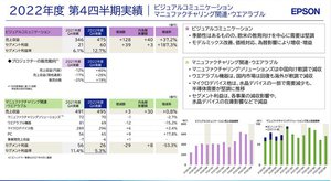 2022年度4Q、ビジュアルコミュニケーションは、欧米教育向けを中心にプロジェクター需要は堅調、注残解消も進み、販売数量が増加した。モデルミックスの改善、価格対応や為替影響により増収・増益となった。