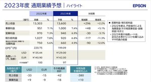 2023年度通期業績予想は以下のとおり。世界経済成長の鈍化を見込むが、半導体調達難や物流混乱は改善し、物流費減少、高騰してきた部材費は横ばいで推移すると見る。オフィス・ホームプリンティングで、大容量インクタンクモデルの先進国での認知度向上や、新興国でのビジネス需要の回復による伸長を見込む。ビジュアルコミュニケーションで、市場規模は、オフィス向けは縮小と見るものの、教育向けやスマートプロジェクターなどが堅調で全体に前年度並みに底堅く推移すると見る。