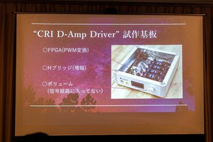 「CRI Full Digital Audio Solution」は、音声出力処理を「CRI D-Amp Driver」という独自のソフトウェアで行っている。CRI D-Amp Driverは、PWM変換をするためのFPGAの制御部分と、増幅を行うH-ブリッジから構成されている。いずれもアナログ部がなくすべてデジタルで伝送するためにノイズが少ないこと、また高価なオーディオ専用部品ではなく、汎用的なパーツで組み上げることができるのでコストを抑えることができるという。