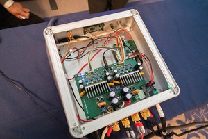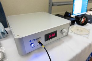 また、信号経路上にボリューム回路が入っていないことも大きな特徴。通常のデジタルボリュームでは、ビット落ちによる音質劣化という大きな課題を持つが、このCRI D-Amp Driverでは電源電圧を変動させることで音量を変えることができる。イベントの会場では、試作機の後ろに大型の電圧変動マシンが置かれていたが、これはスピーカーを駆動するためにこのサイズが必要になるということで、ヘッドホンなどより小さい出力でいい場合はもっと小型化することもできるとのこと。