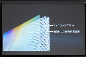 有機ELパネルは発光層とガラス層からなるが、マイクロレンズ有機ELではガラス層に、1画素あたり数千個のレンズを備えた「マイクロレンズアレイ」を採用。発光層はガラス層に蒸着させて成形するため、こちらも凹凸形状となっている。