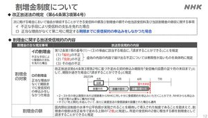 一方、例えば単身赴任で家族で別居した際には新規契約分が通常の半額になるといった割引制度や、社会福祉施設や学校、公的扶助受給者などを対象にした支払い免除制度を用意していることも紹介。割引制度では年間約656億円、免除制度では年間553億円を国民に還元している計算になるという。